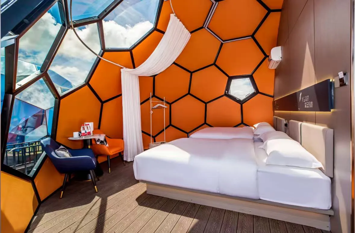 Zařízení v tomto Hvězdovém domě top vesmírné kapsle jsou velmi kompletní. Uvnitř je postel, toaleta, stůl, pohovka a samostatná sprchová místnost, která vám dává pocit domova. Design domu Top Space Capsule je založen na skvělém nápadu: nechte lidi, aby se cítili blízko místa a zůstali pohodlně. Má speciální kulatý vnější skořápku, která může chránit lidi uvnitř před drsným prostředím. Vnitřek je navržen tak, aby byl útulný, s dostatečným prostorem, aby se lidé mohli snadno pohybovat.