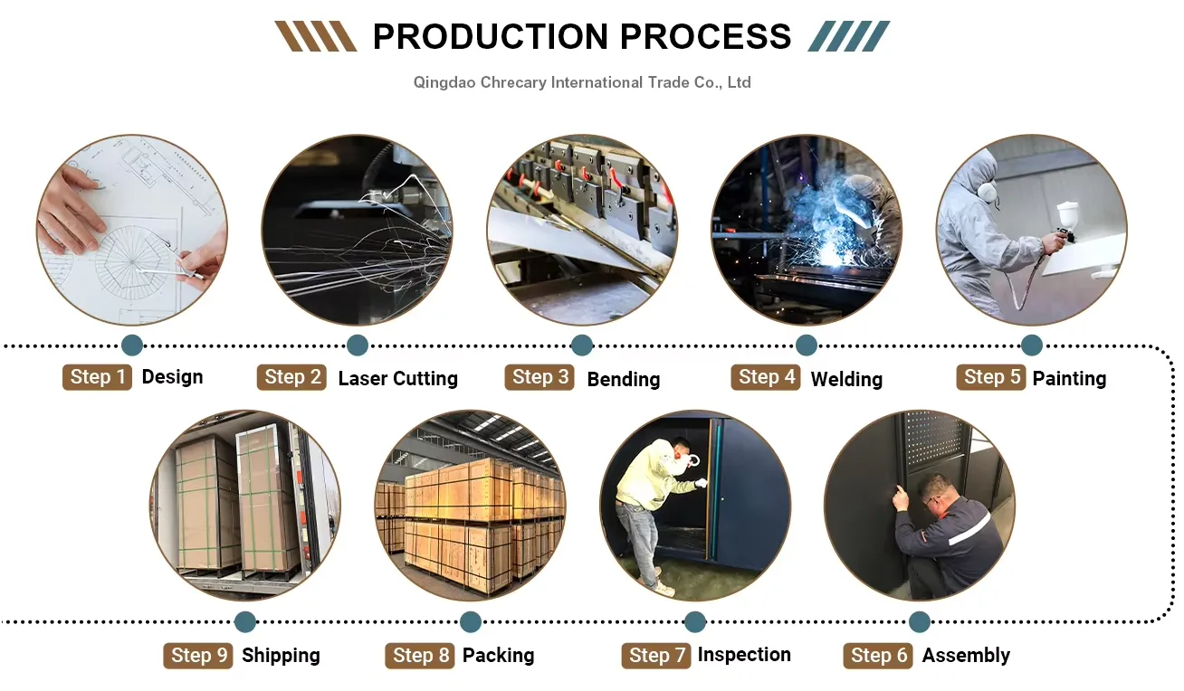 4. Formování a sestavení: Ohybový stroj se používá k přesnému ohýbání řezaných ocelových desek za účelem vytvoření tvarů komponent, jako je tělo skříně a zásuvek. Různé komponenty jsou pevně spojeny prostřednictvím svařovacích procesů, jako je svařovací svařování a svařování oblouku, aby byla zajištěna stabilita celkové struktury. Poté jsou nainstalovány příslušenství, jako jsou sklíčka, zámky a kolečka pro zásuvky.